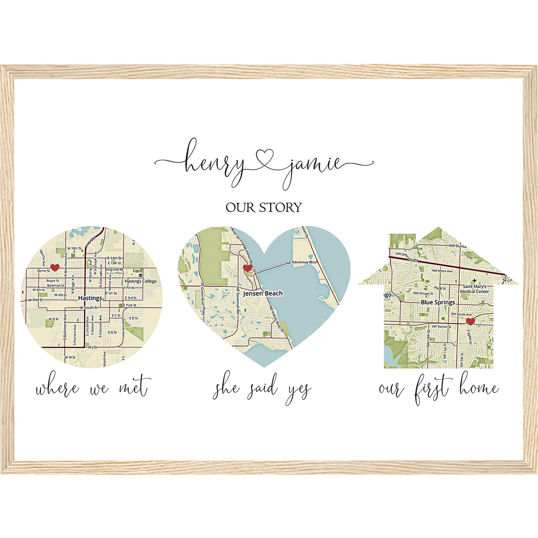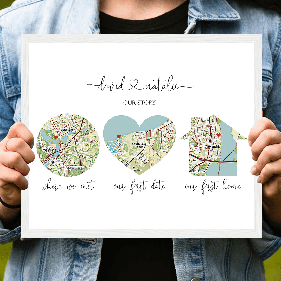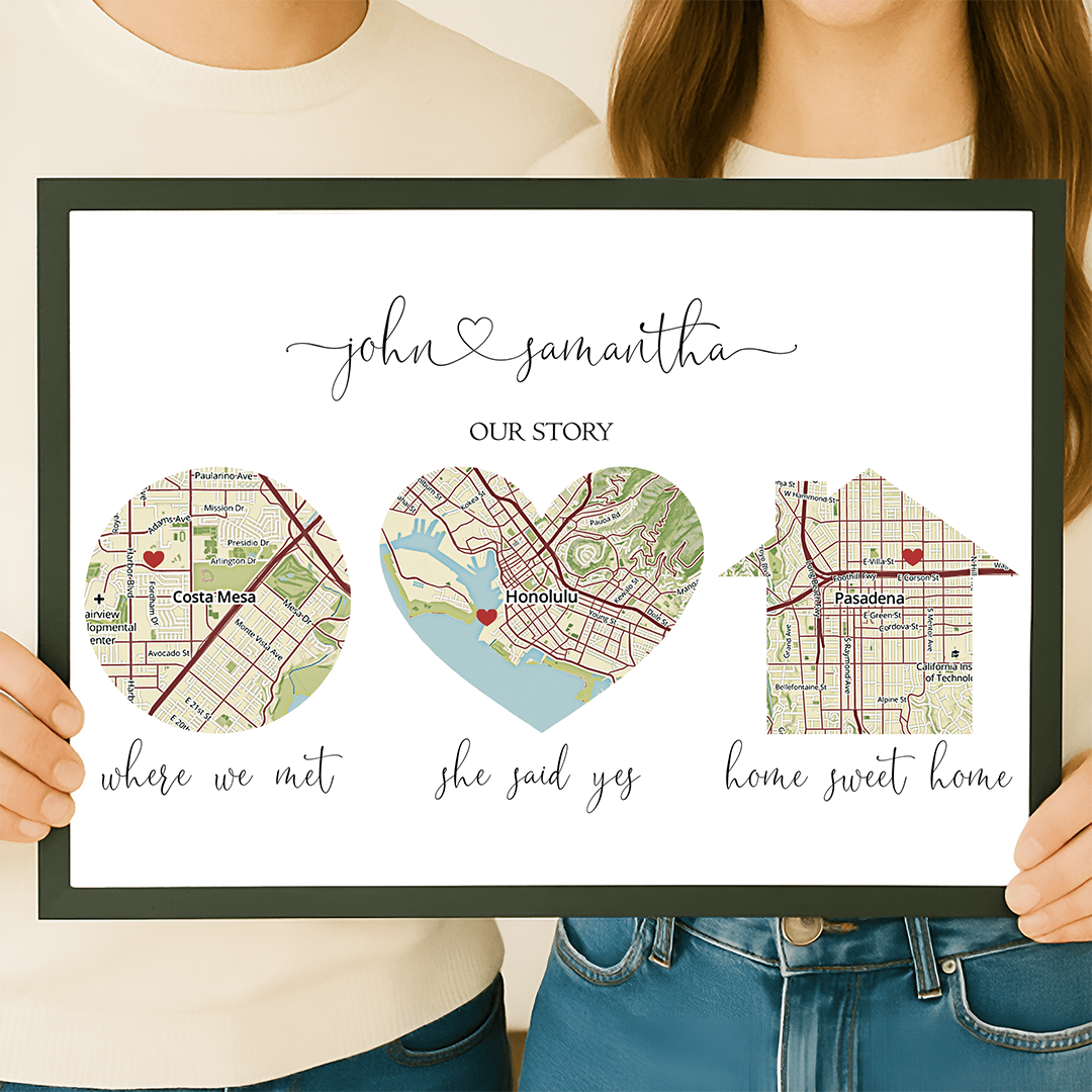 From the place you first met to where you said "I do" — every chapter deserves to be remembered. The Custom Story Map turns your most meaningful moments into timeless art. Whether it's your proposal spot, wedding venue, or the city where your story began, this piece captures it all.
